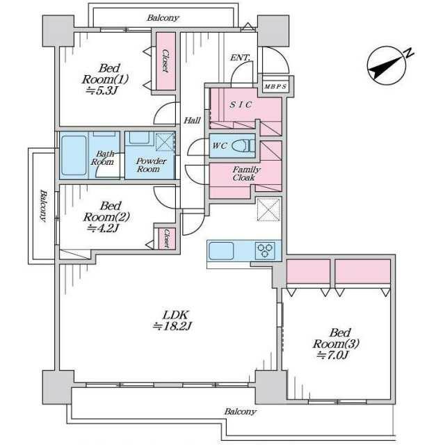 | 間取り(内訳) | 3LDK(洋7/5.3/4.2LDK18.2) | ||